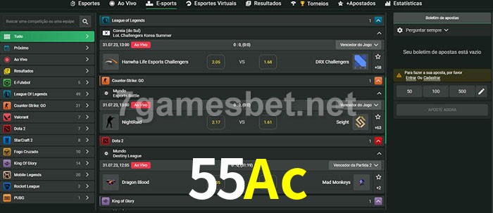 O 55Ac oferece uma grande seleção de opções de apostas em e-sports com probabilidades competitivas